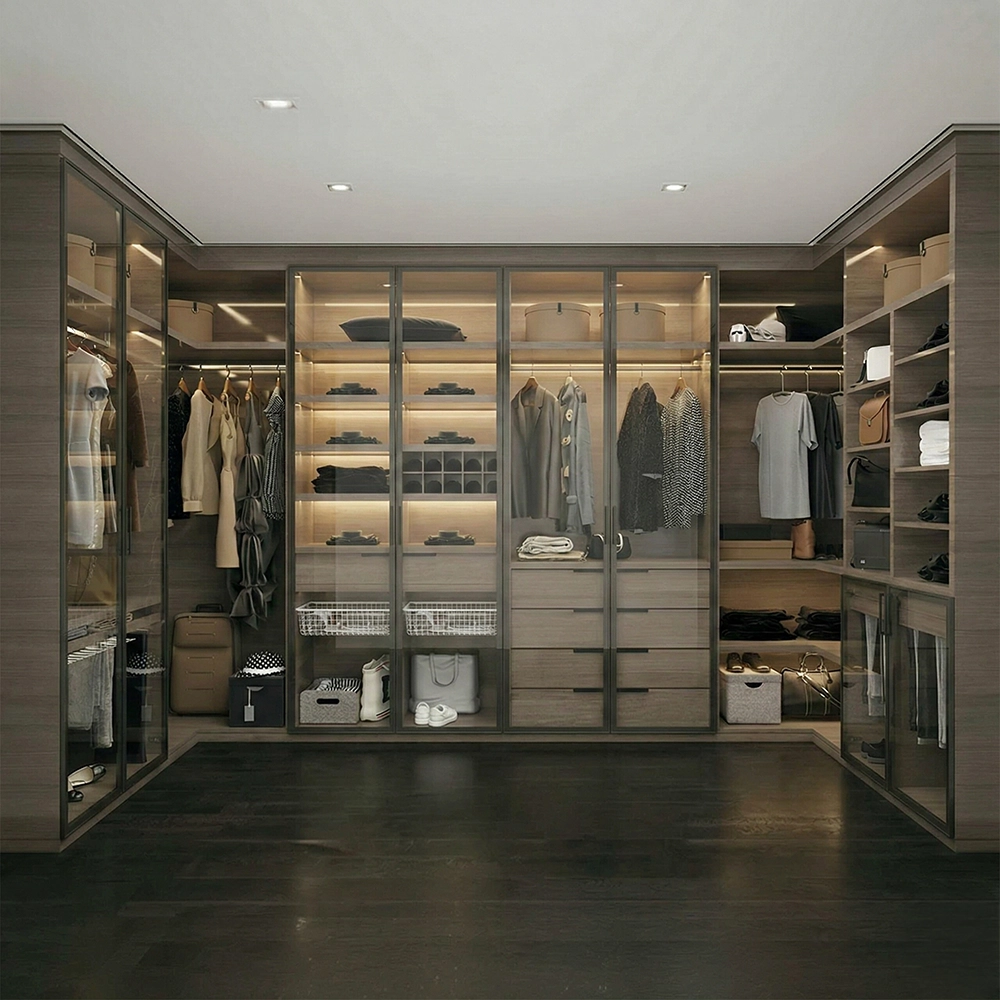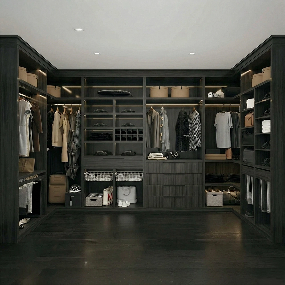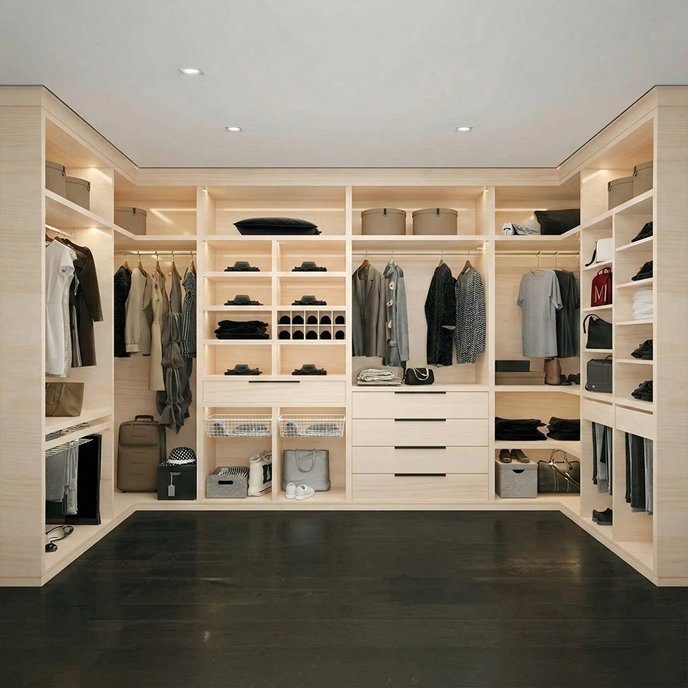 توزيع ذكي يشمل أدراجاً خفية، أرففاً للأحذية، ومساحات تعليق واسعة.