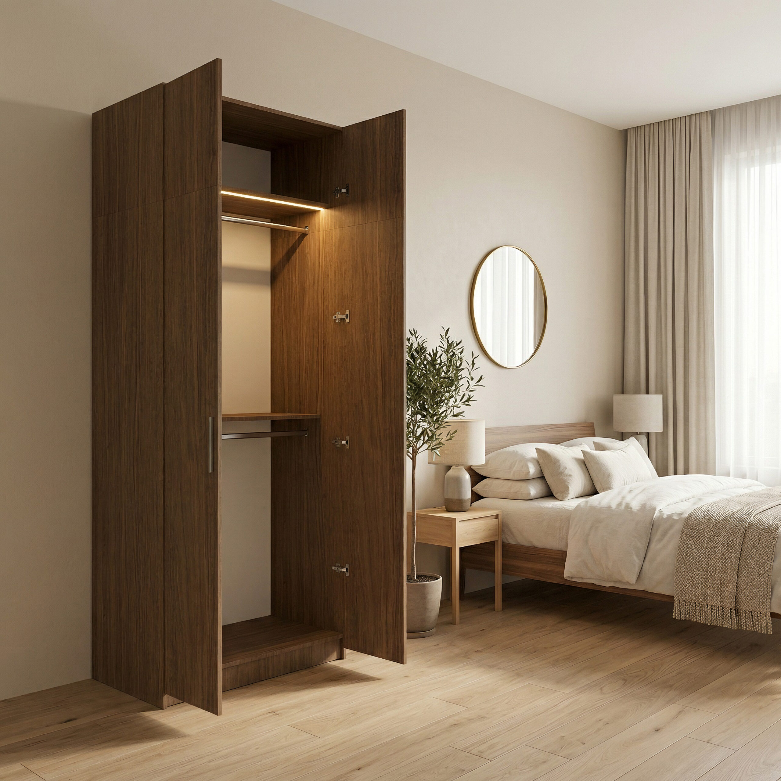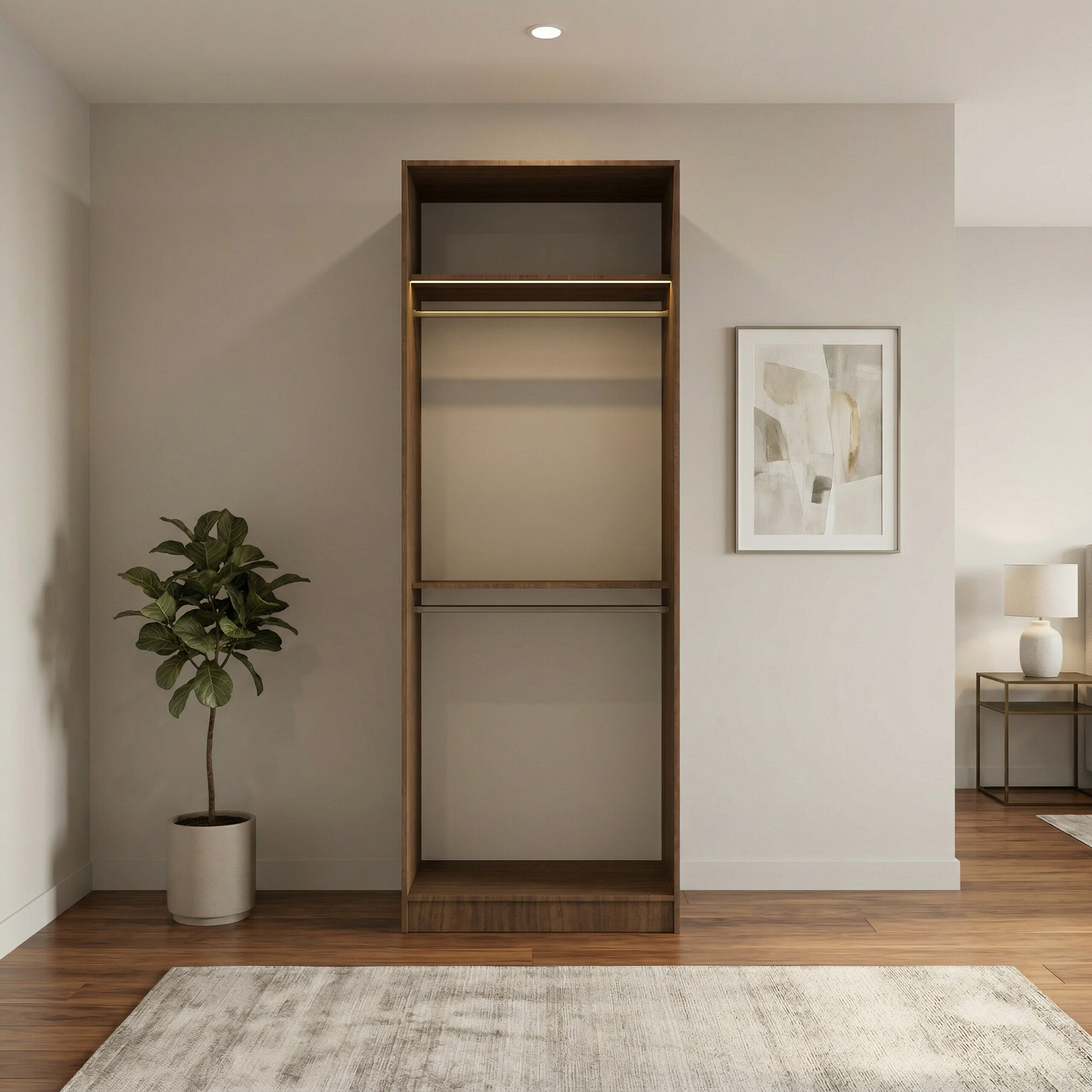 تم تصميم الخزانة بتقسيم داخلي عملي يوفر سهولة في تنظيم الملابس والأغراض اليومية. حيث تحتوي على رف علوي واسع مناسب لتخزين البطانيات أو الملابس المطوية، إضافة إلى مساحة تعليق مخصصة للملابس مزودة بعلاقة معدنية قوية لتعليق القمصان والفساتين والمعاطف بطريقة مرتبة. كما تضم رفاً وسطياً عملياً لتنظيم الملابس المطوية أو الحقائب، مع مساحة تخزين سفلية يمكن استخدامها لحفظ الصناديق أو الأغراض الأخرى.