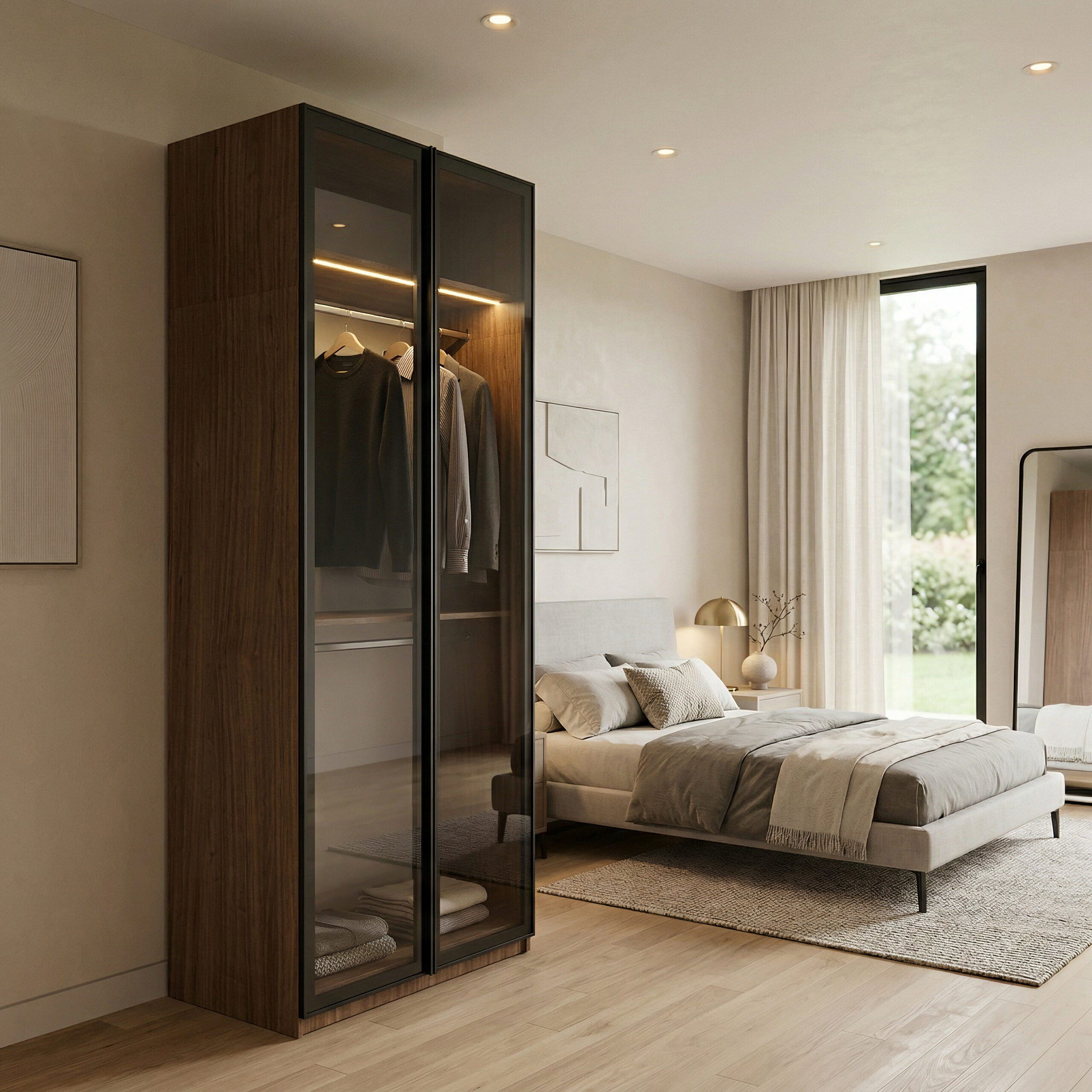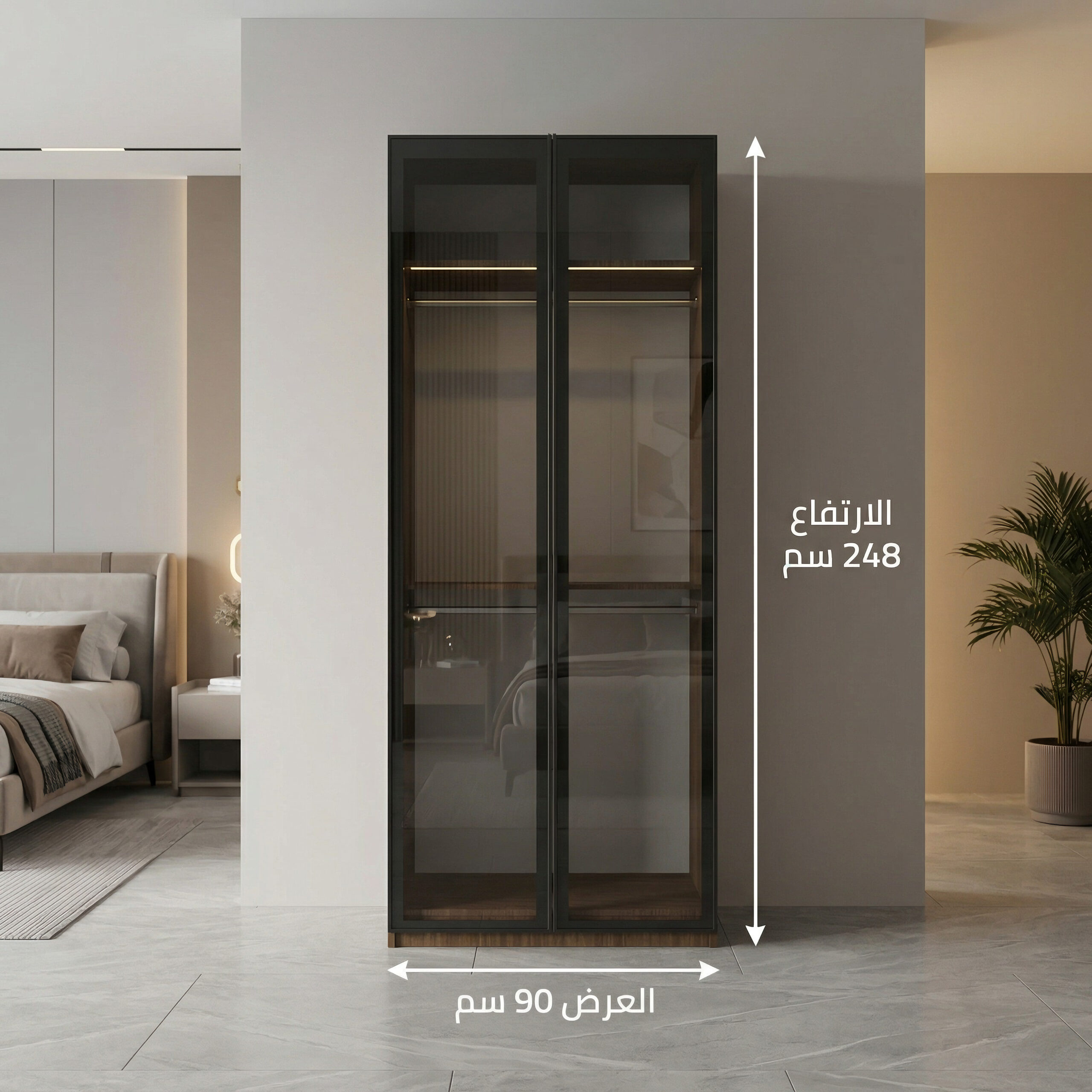 كما توفر الخزانة مرونة في الاختيار والتخصيص، حيث يمكن اختيار الألوان بما يتناسب مع ديكور الغرفة، بالإضافة إلى إمكانية اختيار نوع الأبواب خشبية أو زجاجية حسب الرغبة.