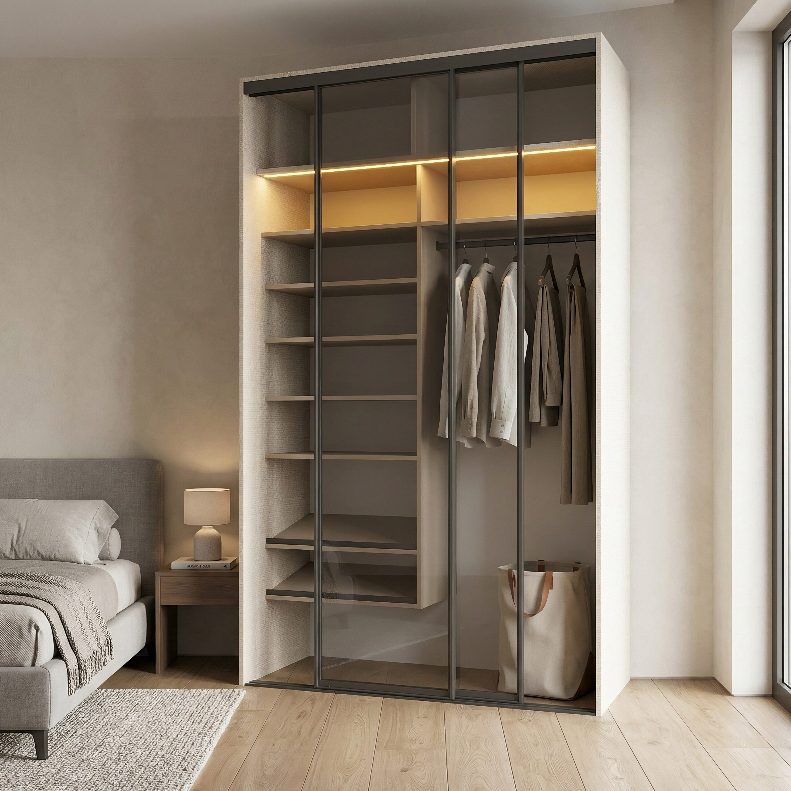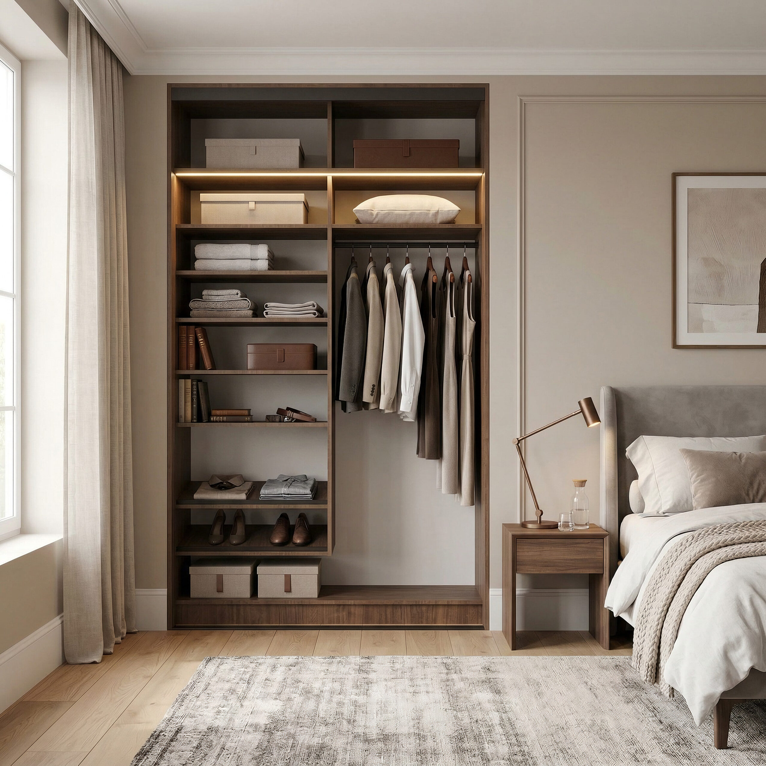 خزانة ملابس بتصميم داخلي عملي يركز على تحقيق أقصى استفادة من المساحة وتنظيم الملابس بطريقة واضحة وسهلة الاستخدام. تم تصميم الخزانة بتقسيم متوازن يجمع بين مساحات التعليق والأرفف المتعددة، مما يجعلها مناسبة لتنظيم مختلف أنواع الملابس والأغراض الشخصية.