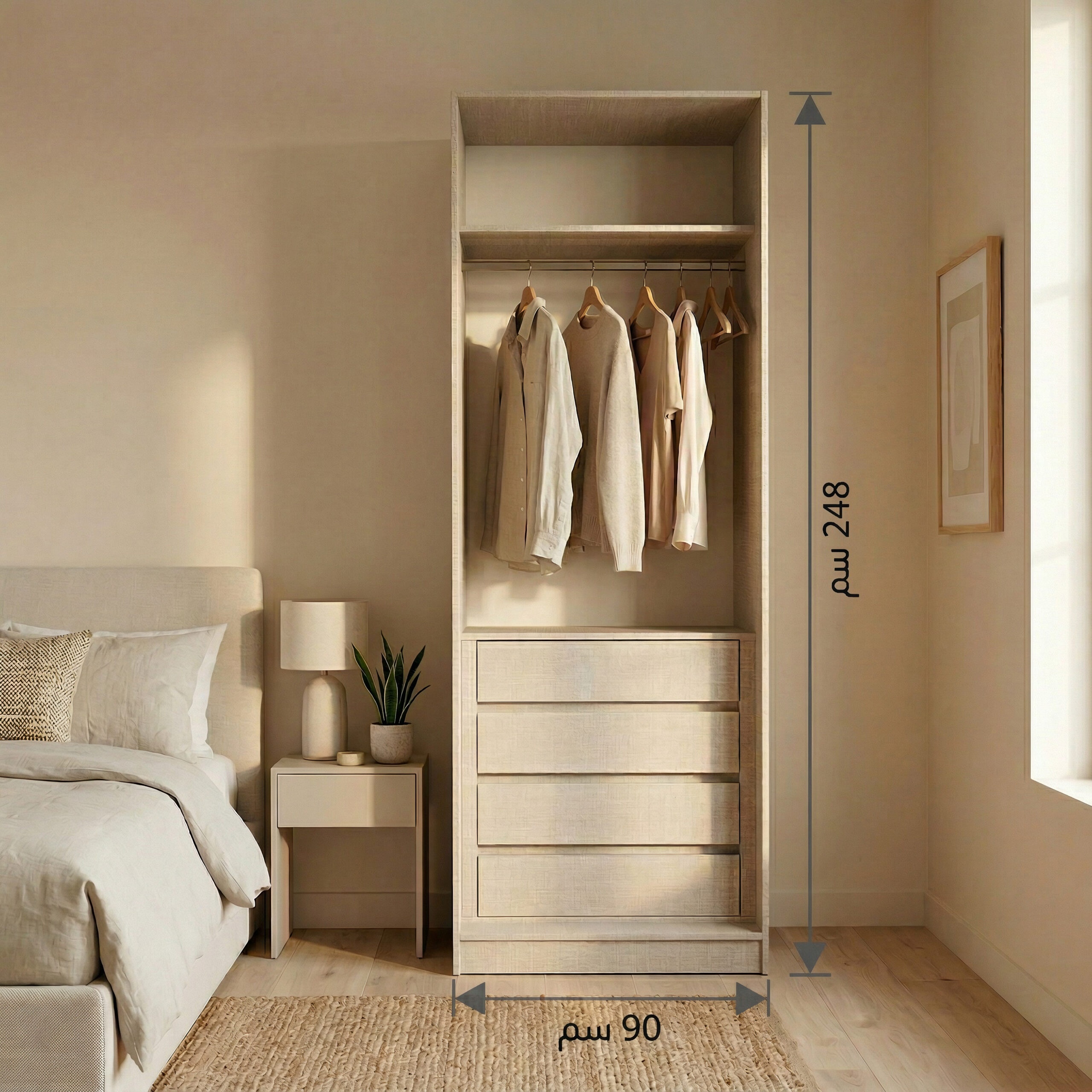 كما يمكن شراء هذا المنتج مع وحدات أخرى بنفس القياس (عرض 90 سم) لتجميع خزانة متكاملة تناسب المساحة والاحتياج، مما يمنحك مرونة أكبر في تصميم خزانة ملابس مخصصة لغرفتك.