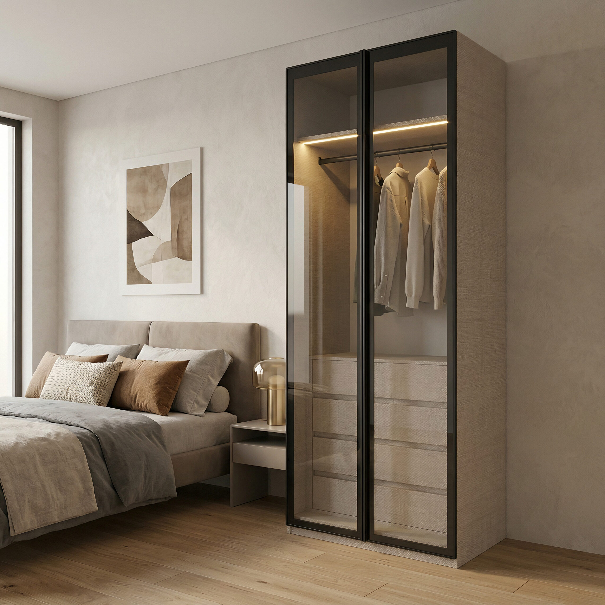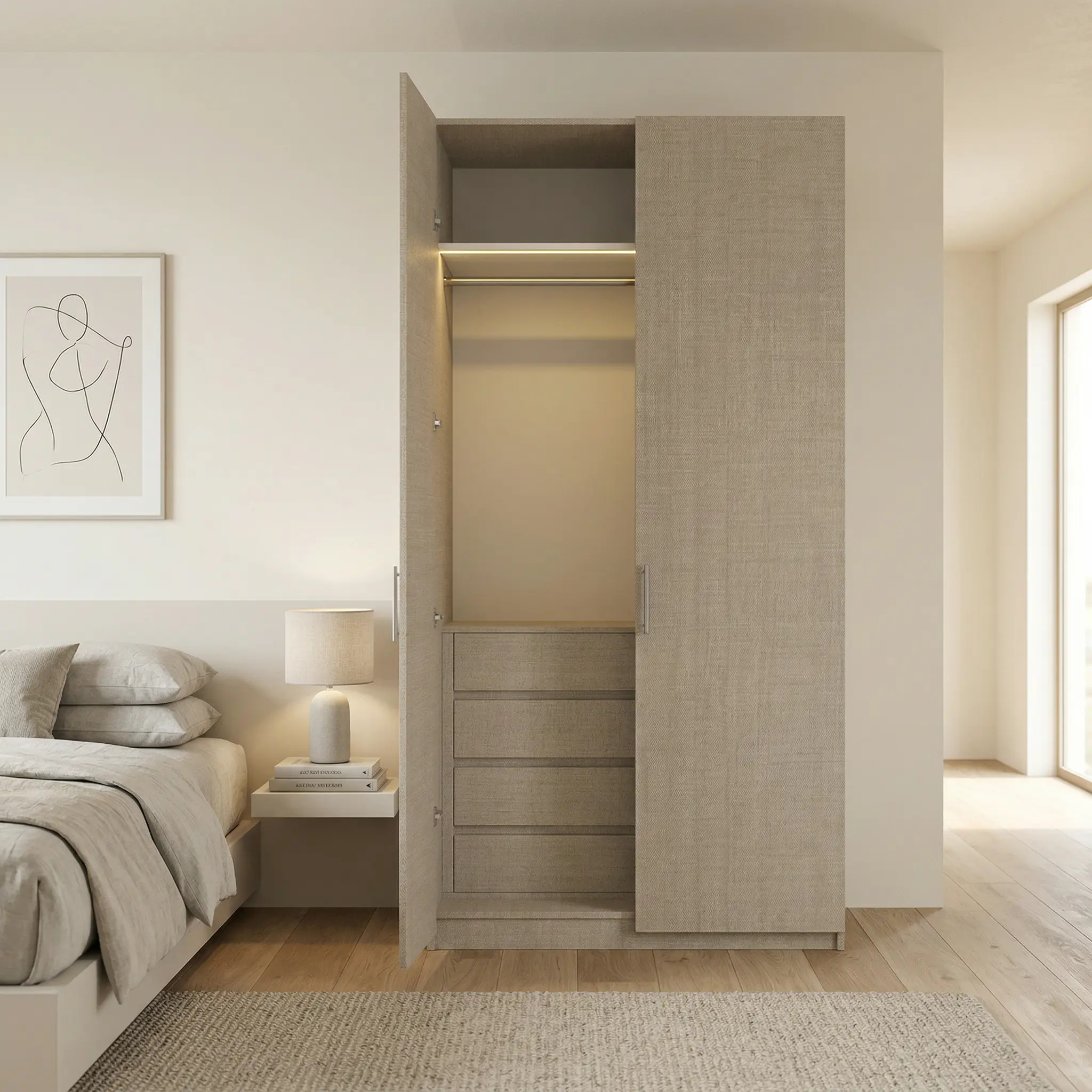 خزانة ملابس بتصميم عصري أنيق تضيف لمسة جمالية لغرفة النوم وتوفر حلاً عمليًا لتنظيم الملابس. مصنوعة من خشب الشيبورد عالي الجودة لضمان المتانة والتحمل والاستخدام طويل الأمد. تأتي مع إمكانية اختيار الألوان بما ينسجم مع مختلف أنماط الديكور، إضافة إلى خيار تحديد نوع الأبواب سواء أبواب خشبية أو أبواب زجاجية، لتناسب ذوقك واحتياجك في التصميم. خيار مثالي لمن يبحث عن خزانة تجمع بين الأناقة والعملية.