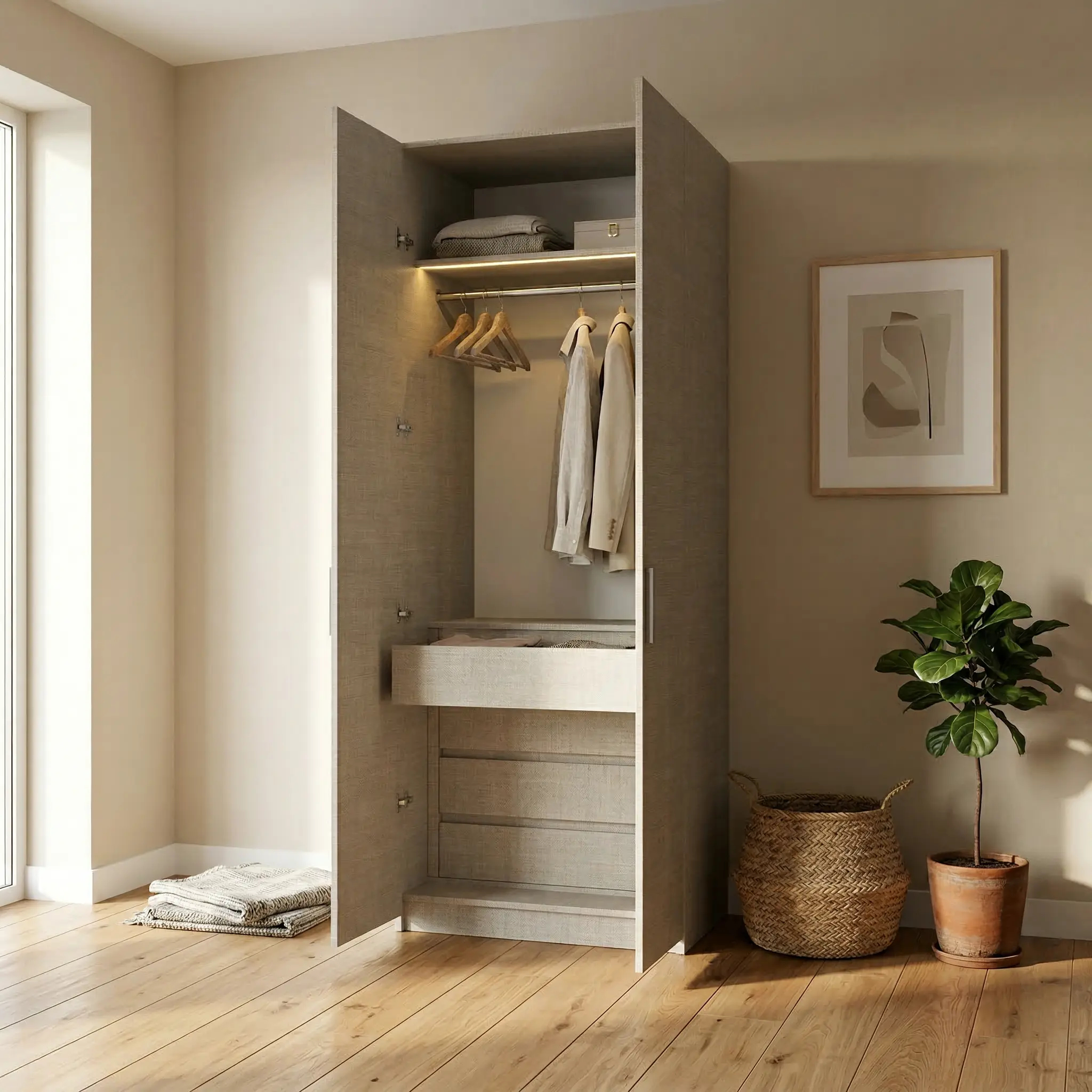 هذا التقسيم يوفر تنظيمًا عمليًا وسهولة في الوصول إلى الملابس مع استغلال مثالي لمساحة الخزانة.