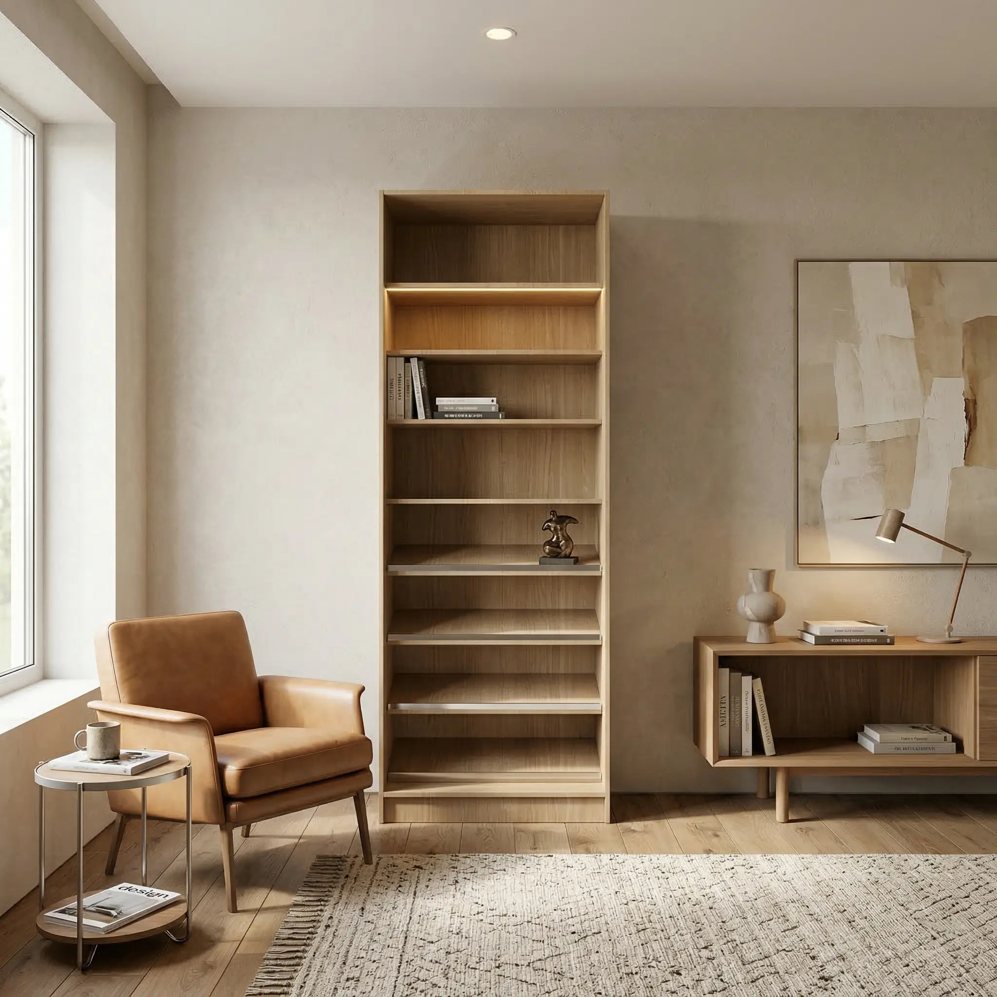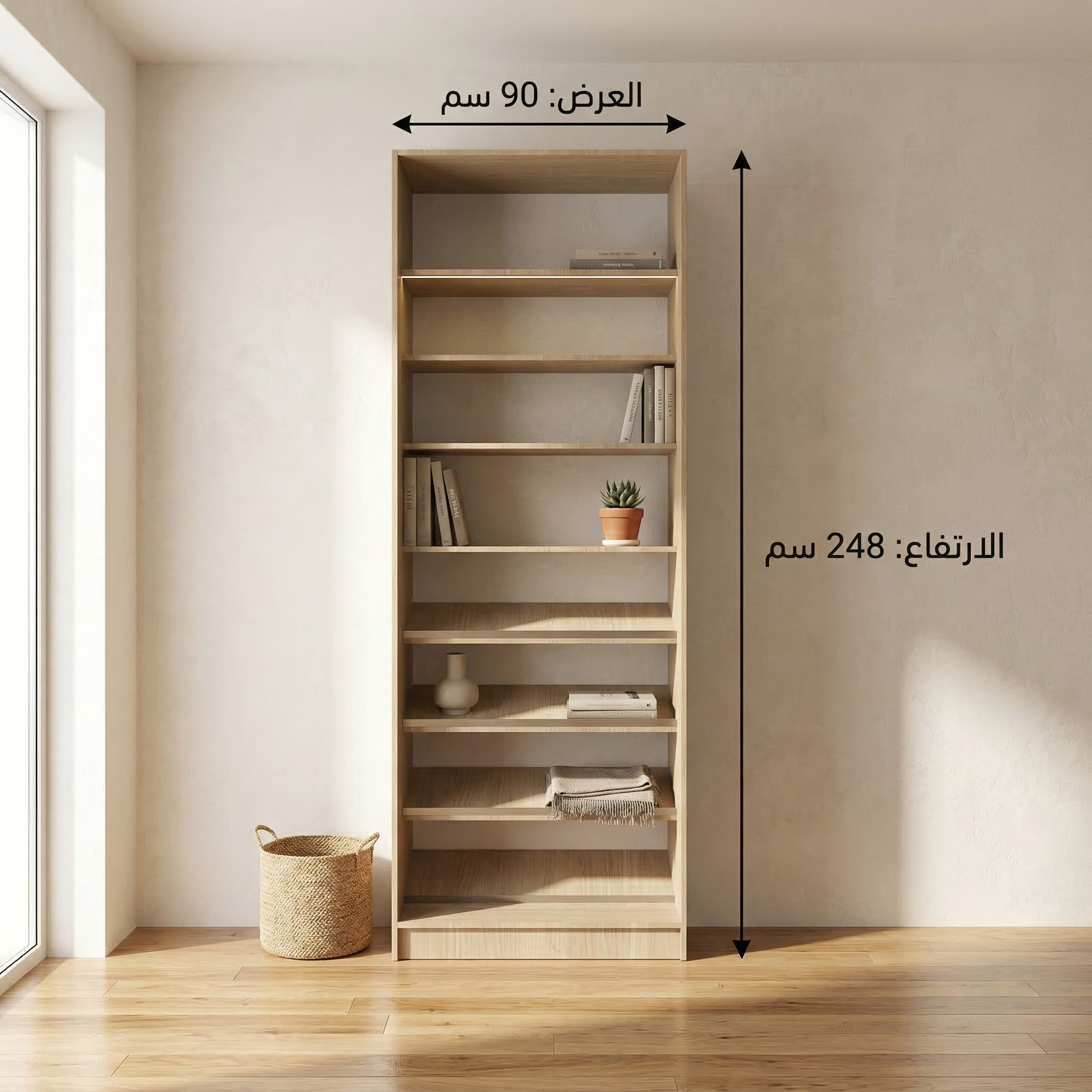 يتميز هذا التصميم بإمكانية استخدامه كوحدة أرفف مفتوحة، أو إضافة أبواب خشبية أو زجاجية حسب الرغبة للحصول على مظهر أكثر خصوصية وأناقة يتناسب مع أسلوب الغرفة. كما أن لون الخشب الطبيعي ينسجم مع مختلف أنماط الديكور الحديثة.