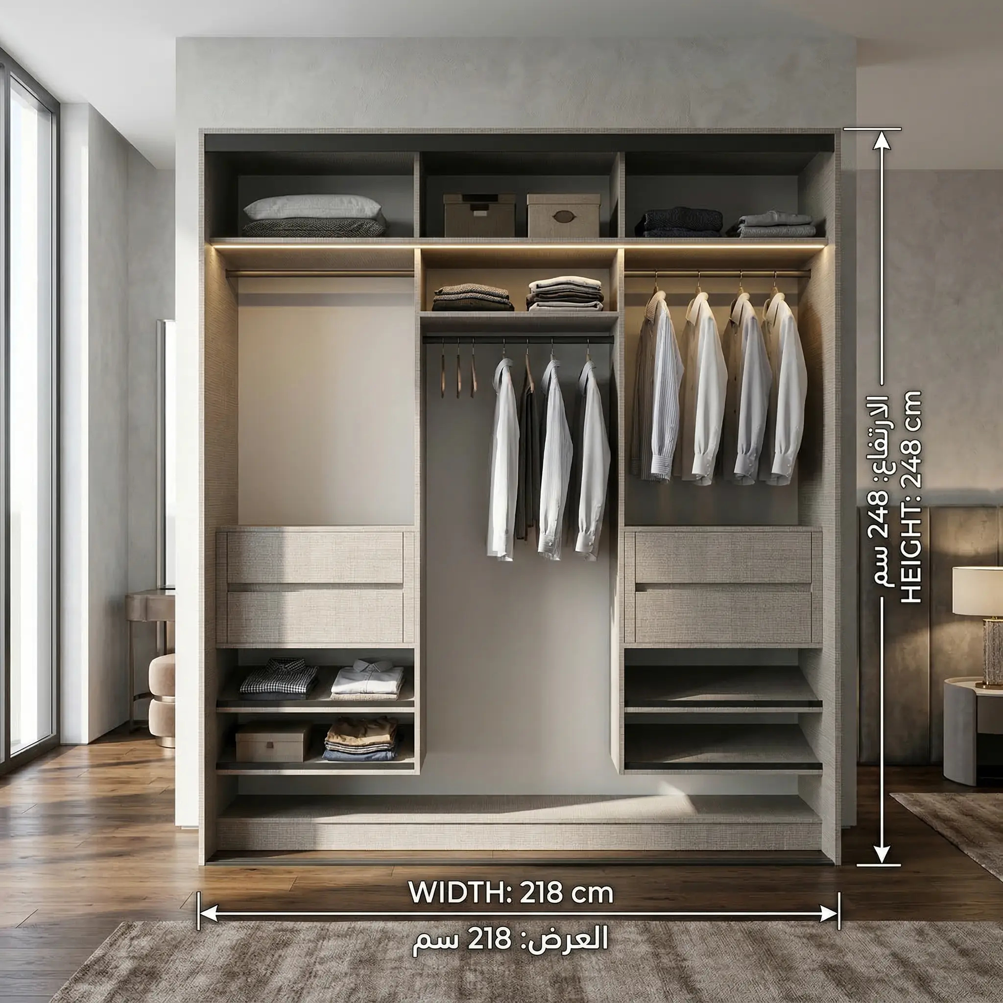 • مساحات تعليق عملية لتعليق القمصان والفساتين والعبايات والبدلات بطريقة تحافظ على ترتيب الملابس.