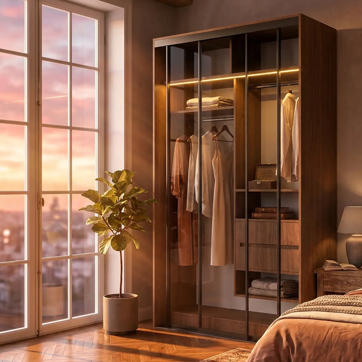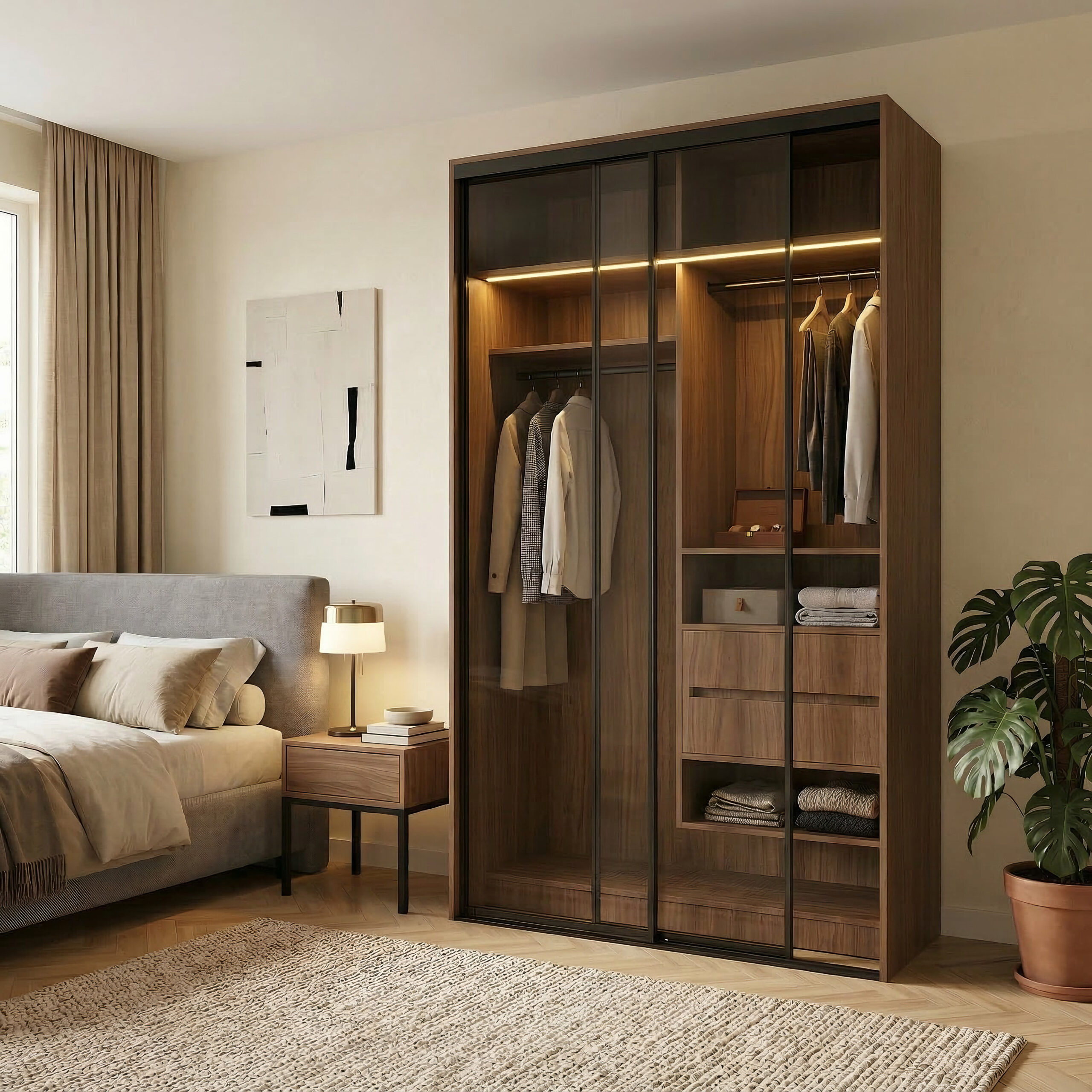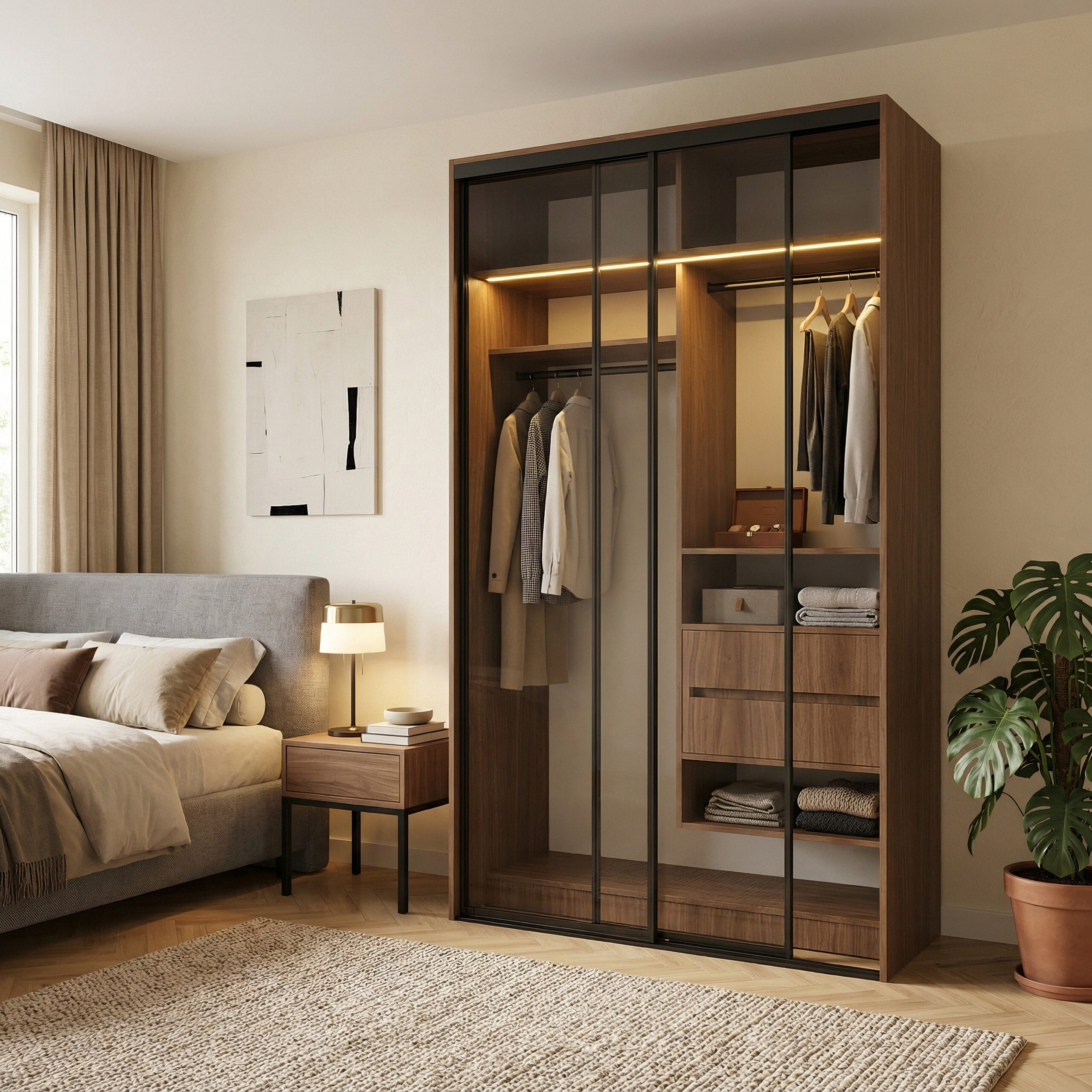 الأبواب المنزلقة تمنحك مظهراً عصرياً راقياً وتوفر المساحة داخل الغرفة، بينما يبرز التصميم الداخلي للخزانة ليحولها إلى قطعة ديكور أنيقة وليست مجرد خزانة ملابس.