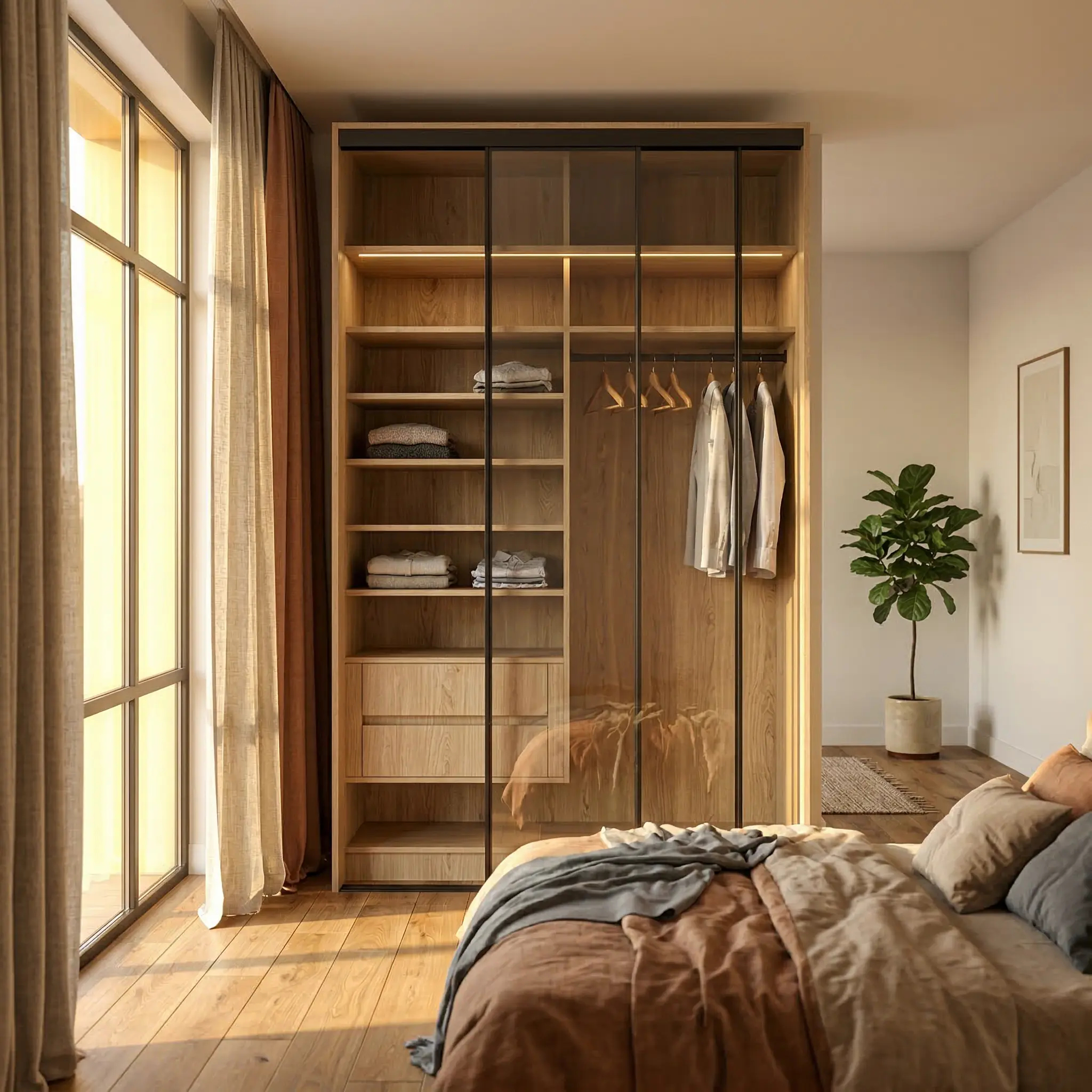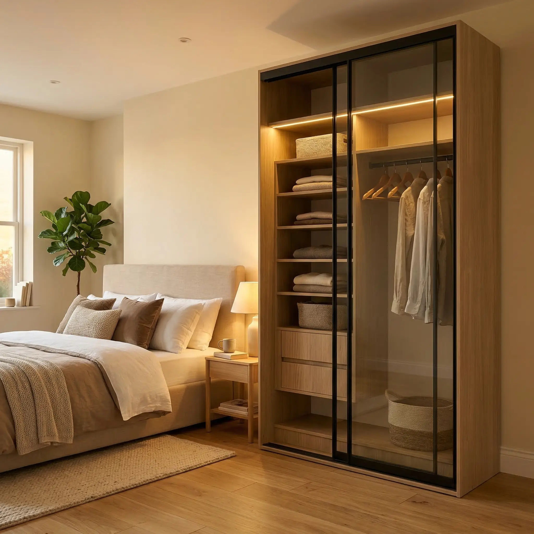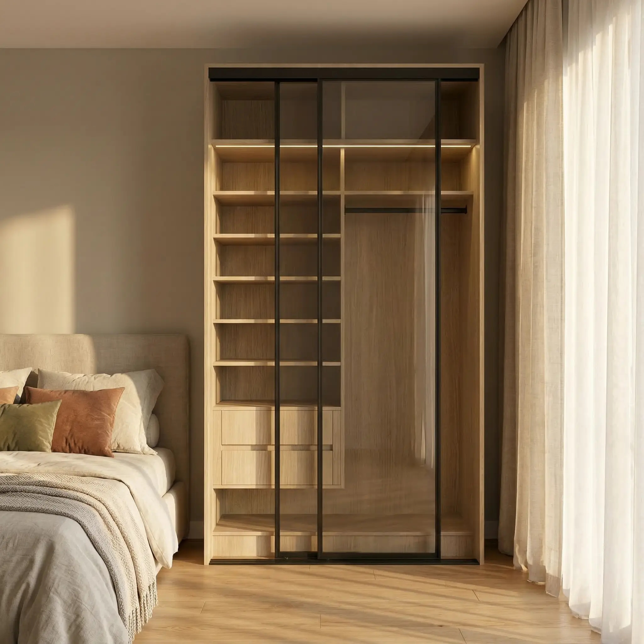 هذا النوع من الخزائن أصبح خياراً مفضلاً في المنازل الفاخرة وغرف الملابس الخاصة بالمشاهير لما يجمعه من مظهر راقٍ وتنظيم احترافي للملابس.