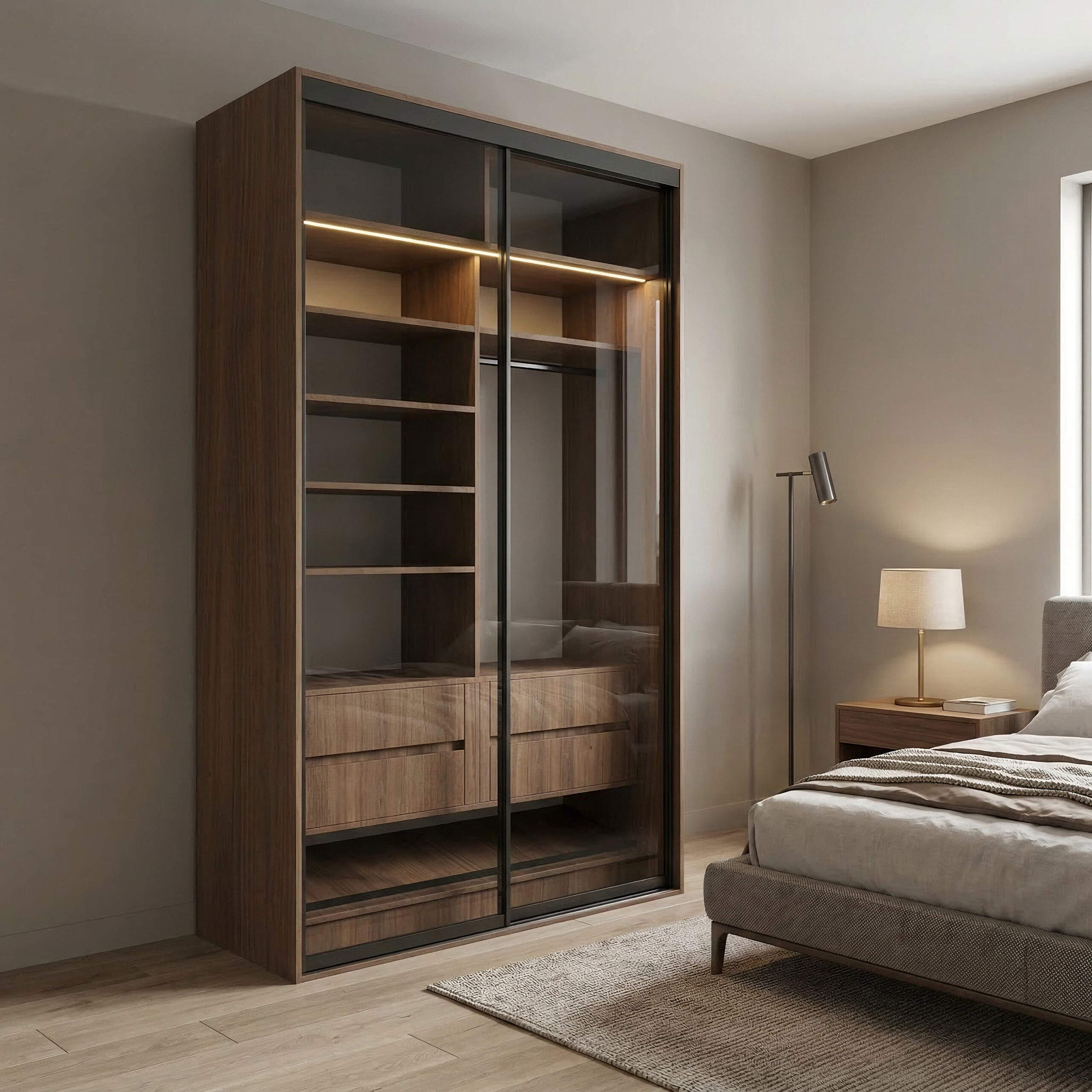 ارتقِ بتنظيم غرفة نومك مع خزانة الملابس المنزلقة من الخزائن الأمثل بعرض 143.6 سم، حيث يجتمع التصميم العصري مع حلول التخزين الذكية في قطعة أنيقة تضيف لمسة فخامة وعملية للمساحة. تتميز الخزانة بأبواب منزلقة زجاجية بإطار أنيق يمنحها مظهراً حديثاً ويتيح حركة سلسة توفر المساحة داخل الغرفة دون الحاجة لفراغ إضافي لفتح الأبواب.