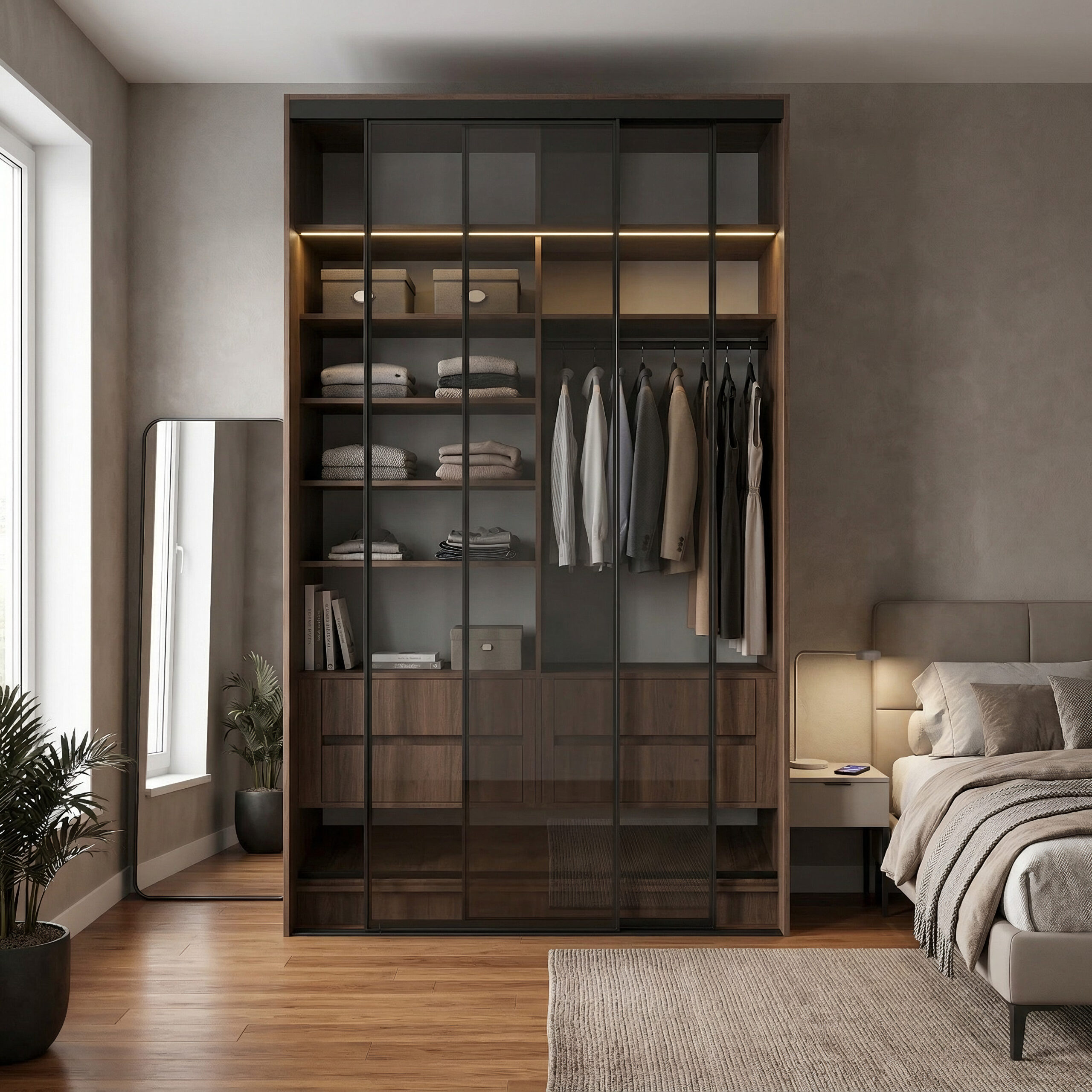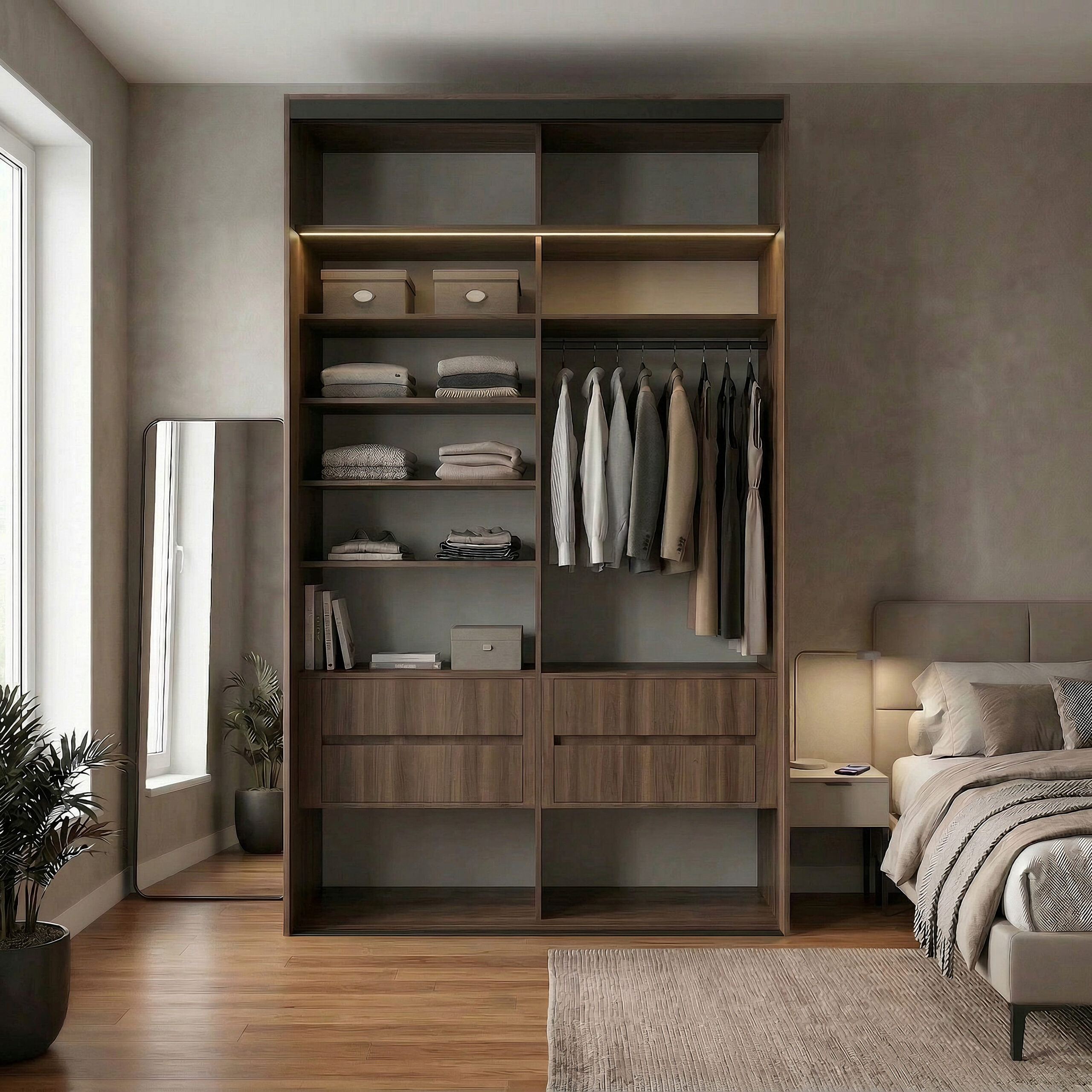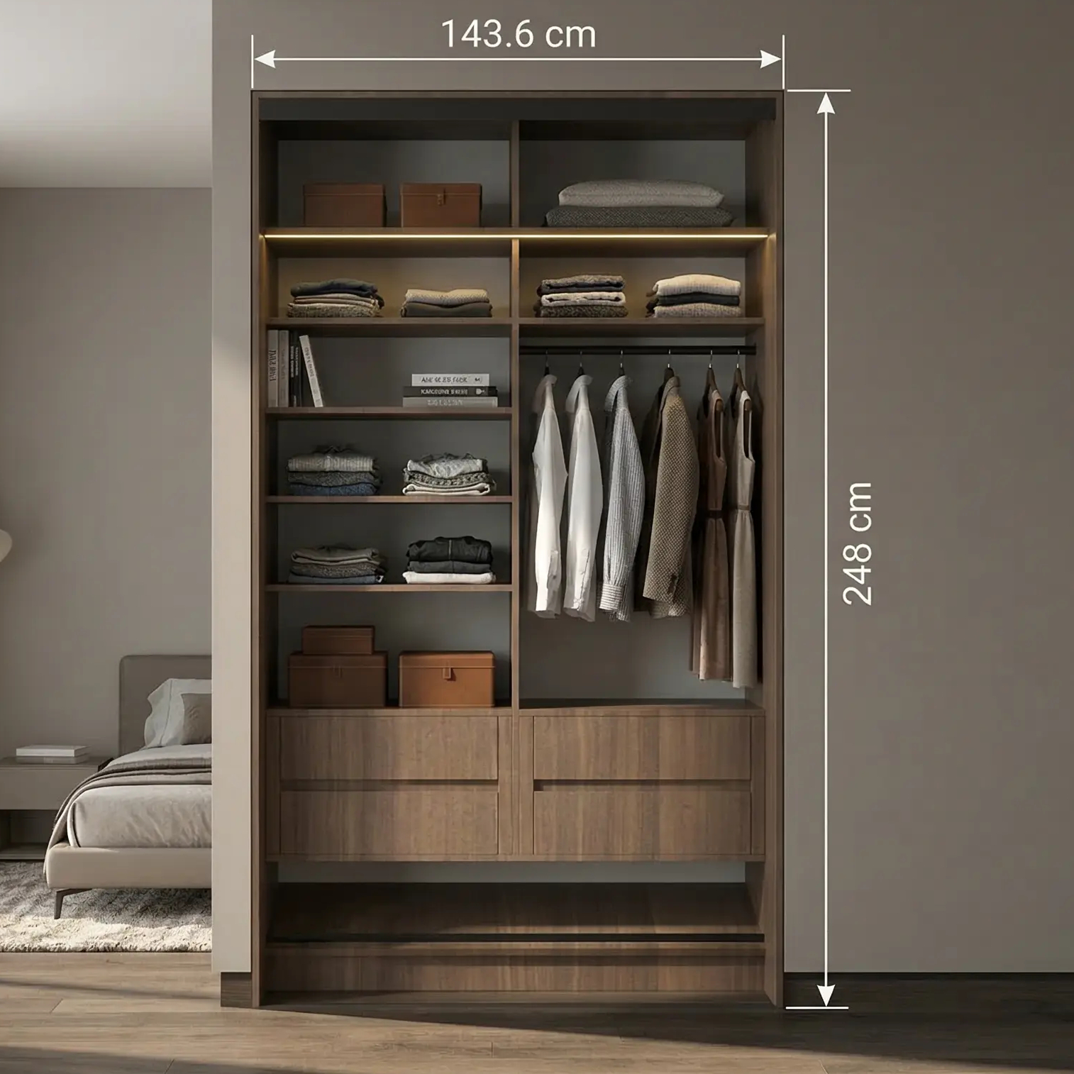 هذه الخزانة ليست مجرد مكان لتخزين الملابس، بل نظام تنظيم متكامل يجمع بين التصميم الحديث والوظيفة العملية،