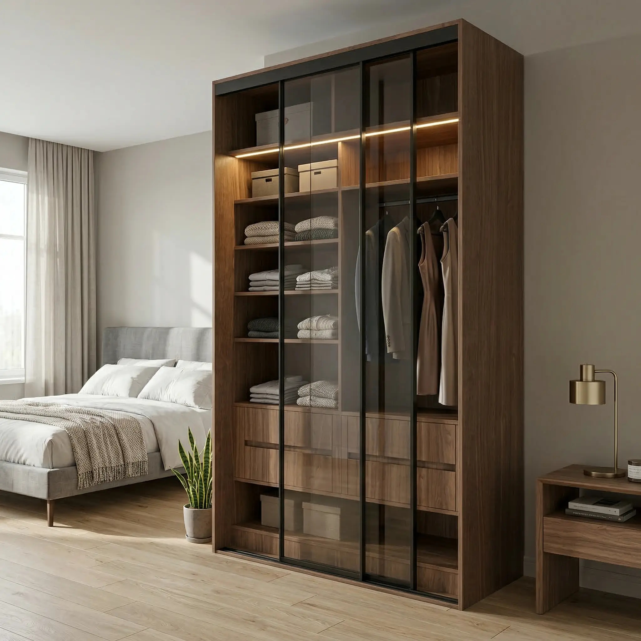 خزانة ملابس أبواب منزلقة 143.6سم مع رفوف وأدراج ومساحة تعليق مزدوجة – الخزائن الأمثل