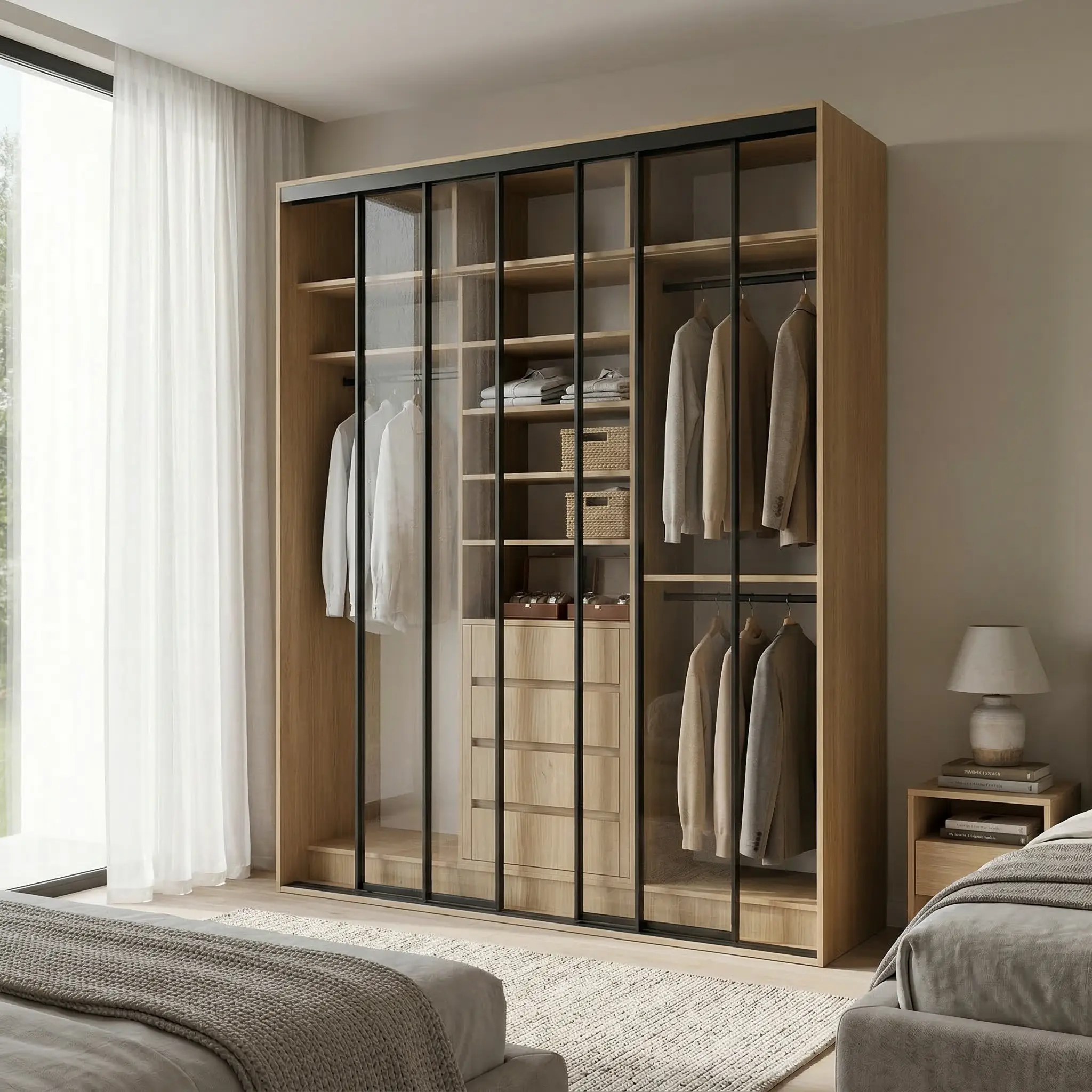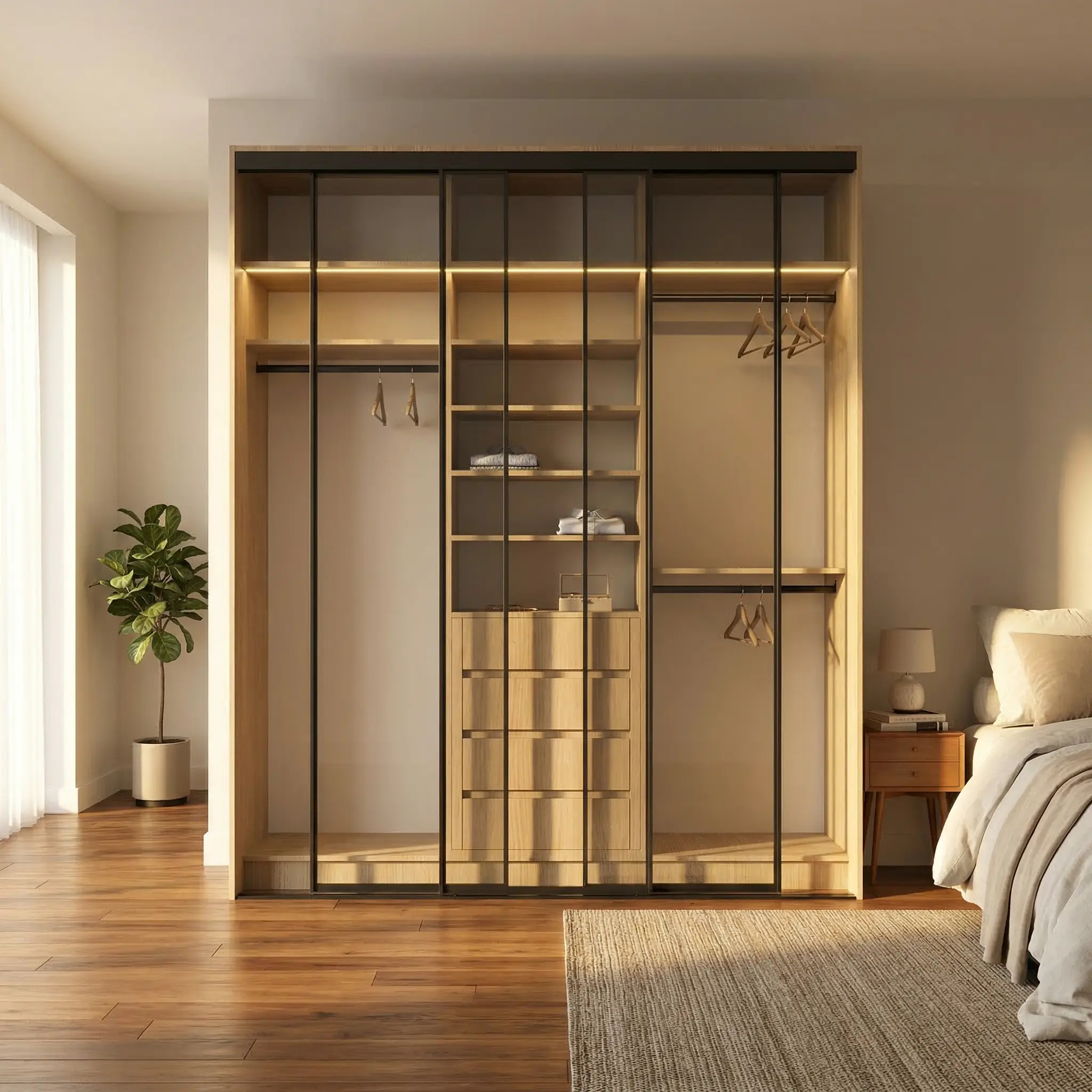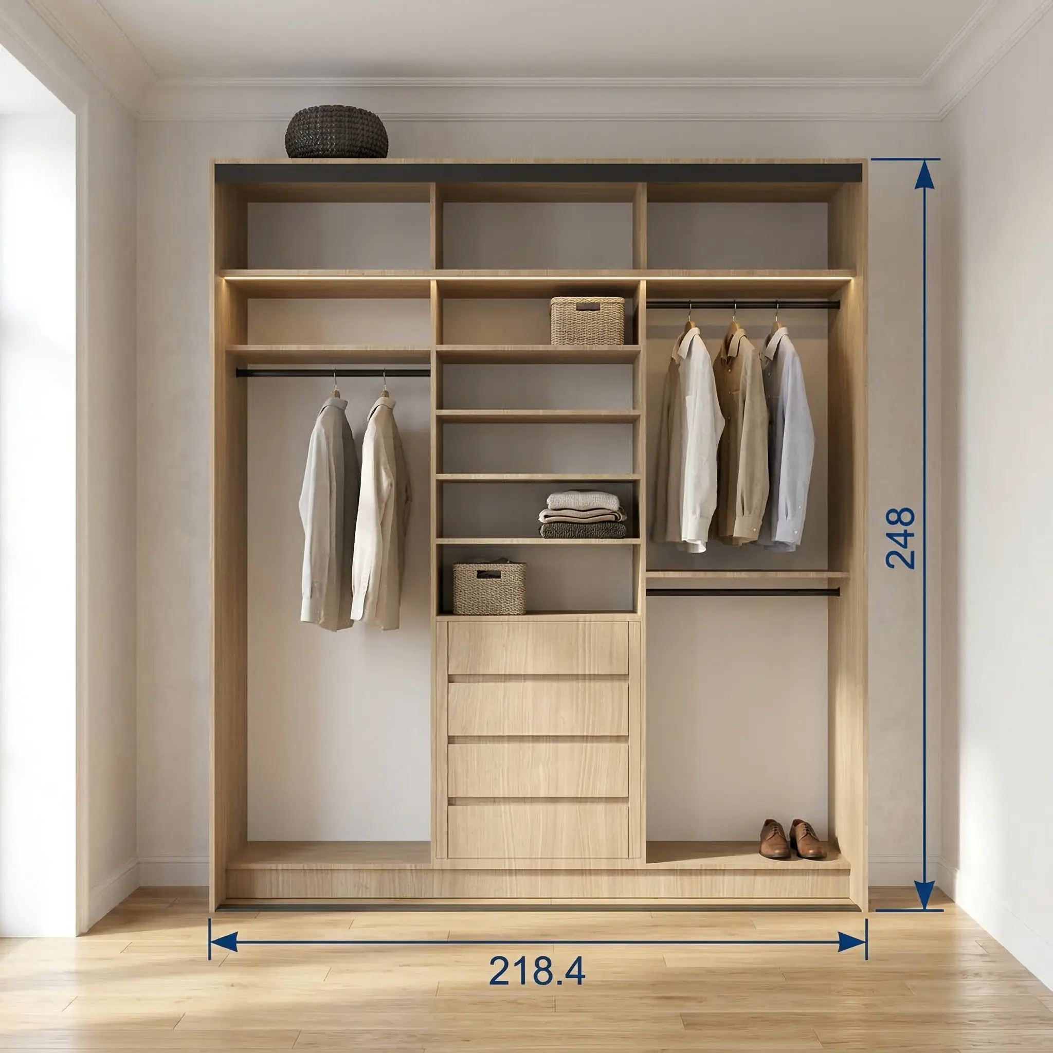 يتميز التصميم الداخلي بتقسيم ذكي يجمع بين مساحات تعليق طويل للملابس مثل العبايات والفساتين والثياب، وتعليق قصير للتيشيرتات والفساتين القصيرة لمنعها من التجعد إضافة إلى رفوف متعددة للملابس المطوية مثل التيشيرتات والملابس التيشيرتات ، مع أدراج عملية لتنظيم الإكسسوارات والقطع الصغيرة بشكل مرتب وسهل الوصول.