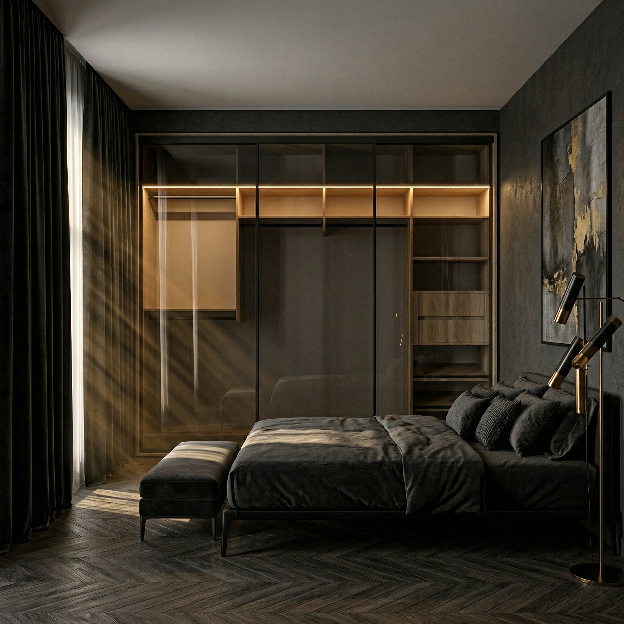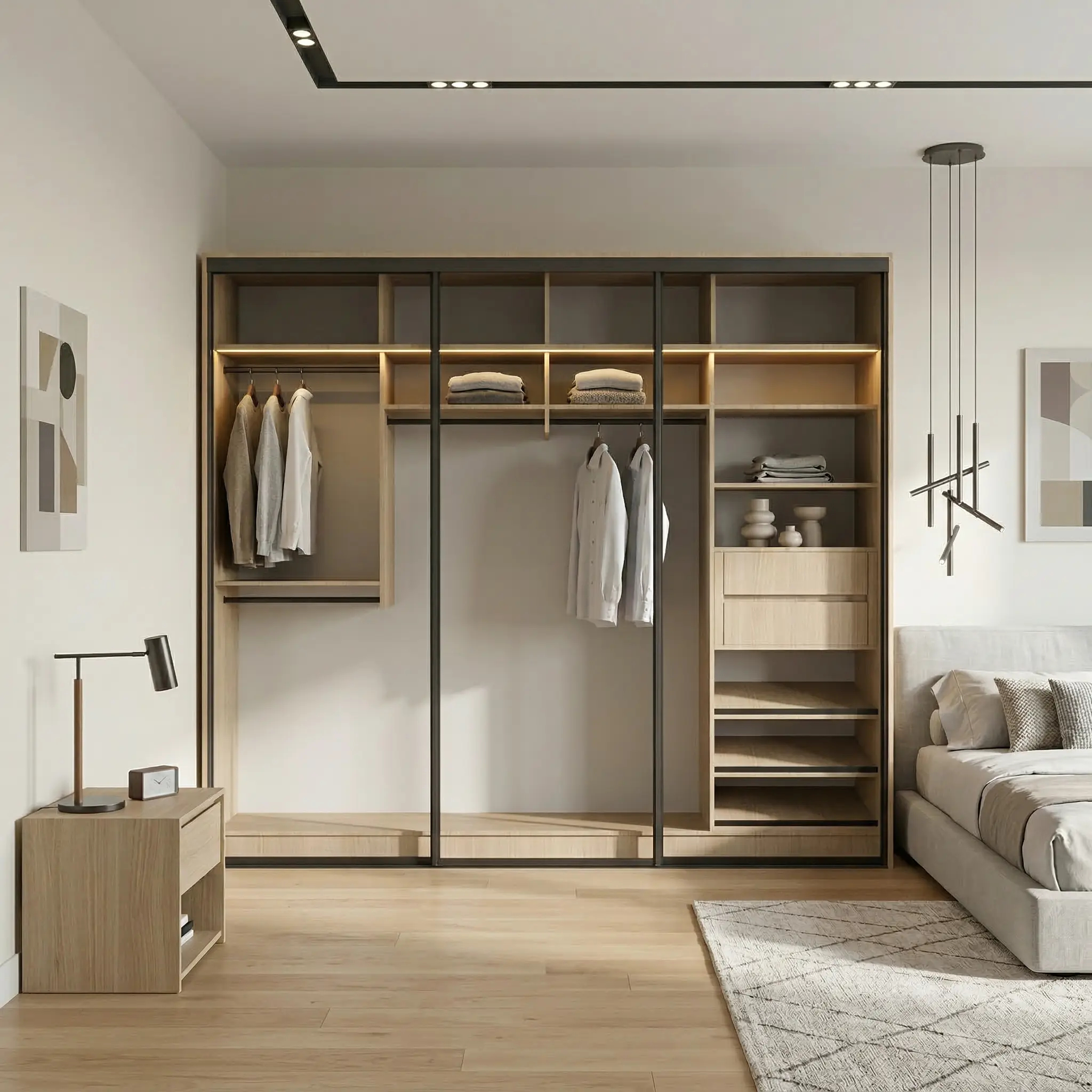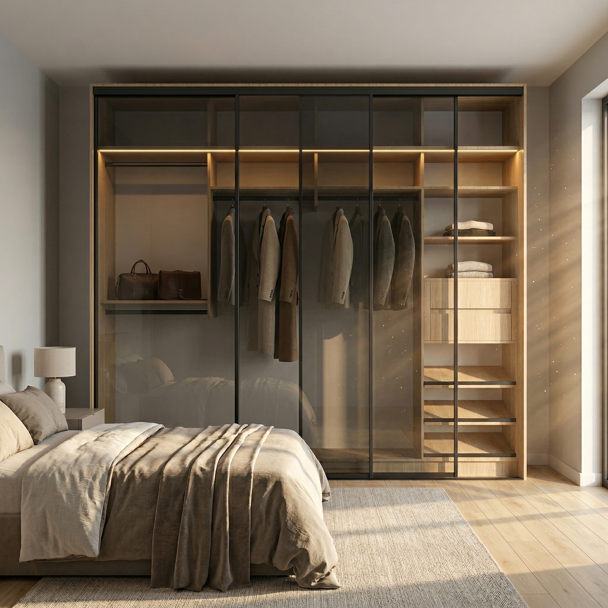 يمكنك تخصيص شكل الخزانة حسب ذوقك باختيار أبواب زجاجية منزلقة لمظهر فاخر أو أبواب منزلقة خشبية لإحساس دافئ وأنيق، مع إمكانية إضافة إضاءة داخلية وخلفية لتعزيز جمال التصميم وسهولة الاستخدام.