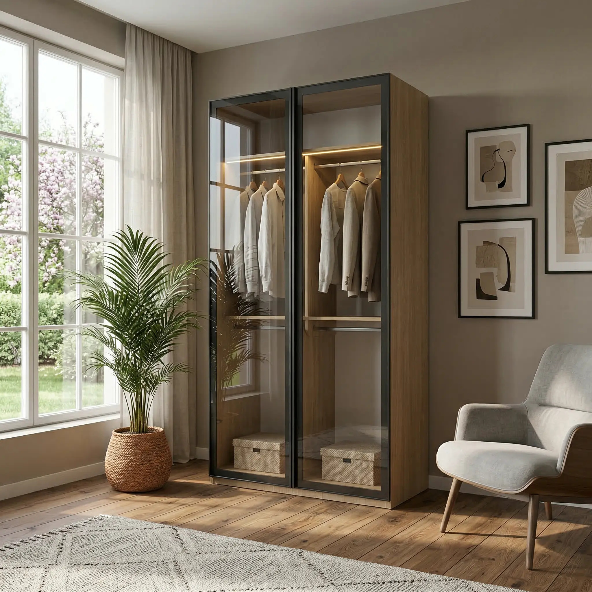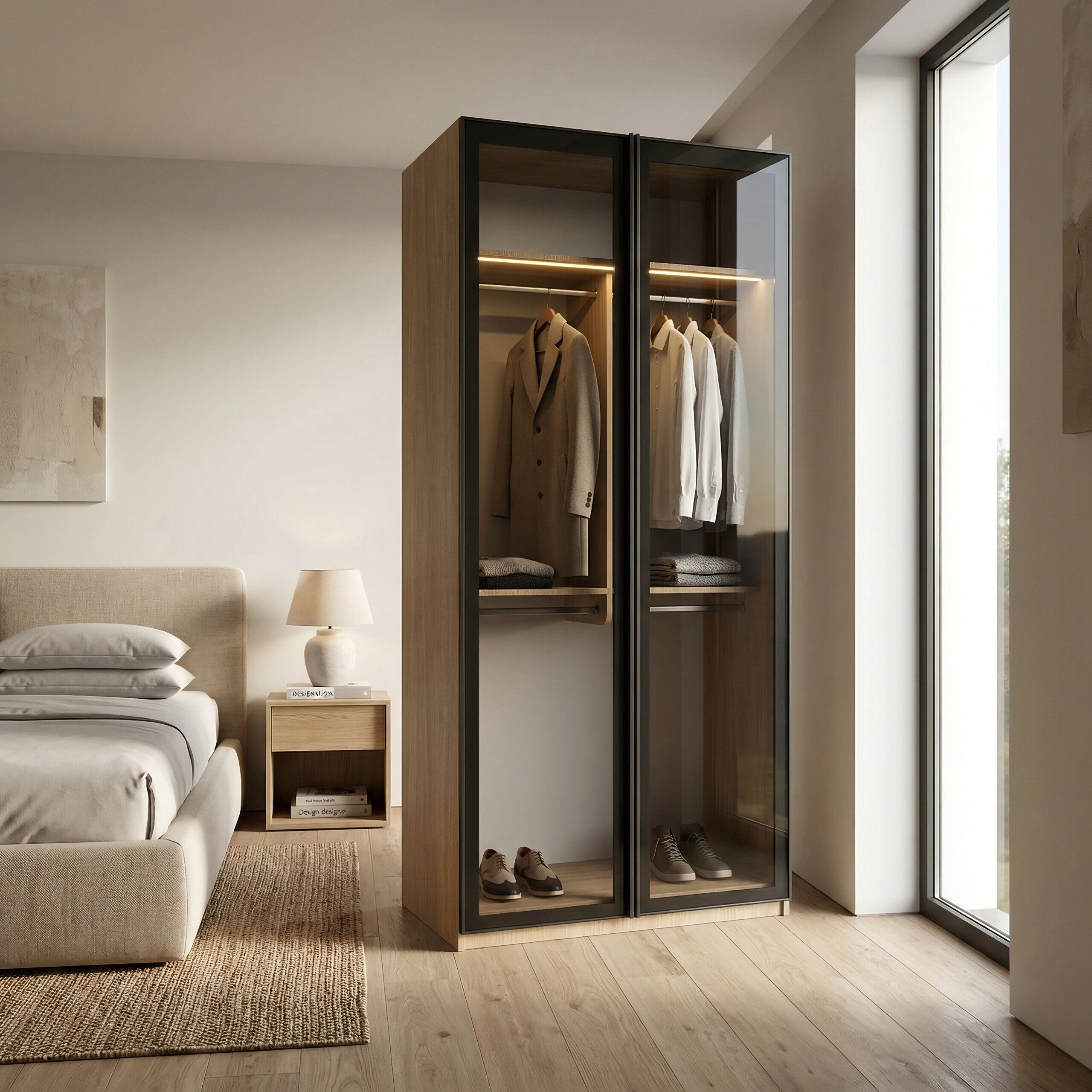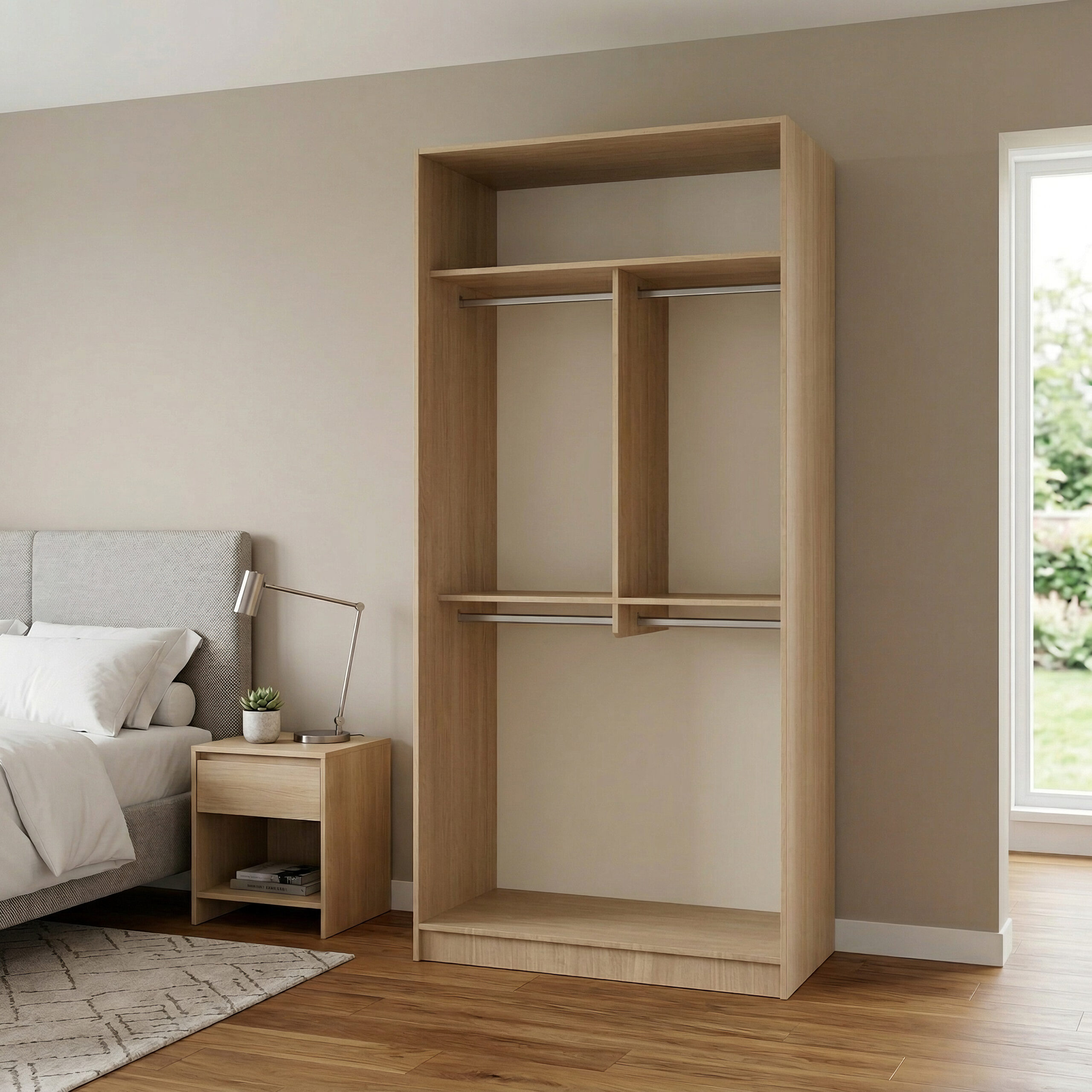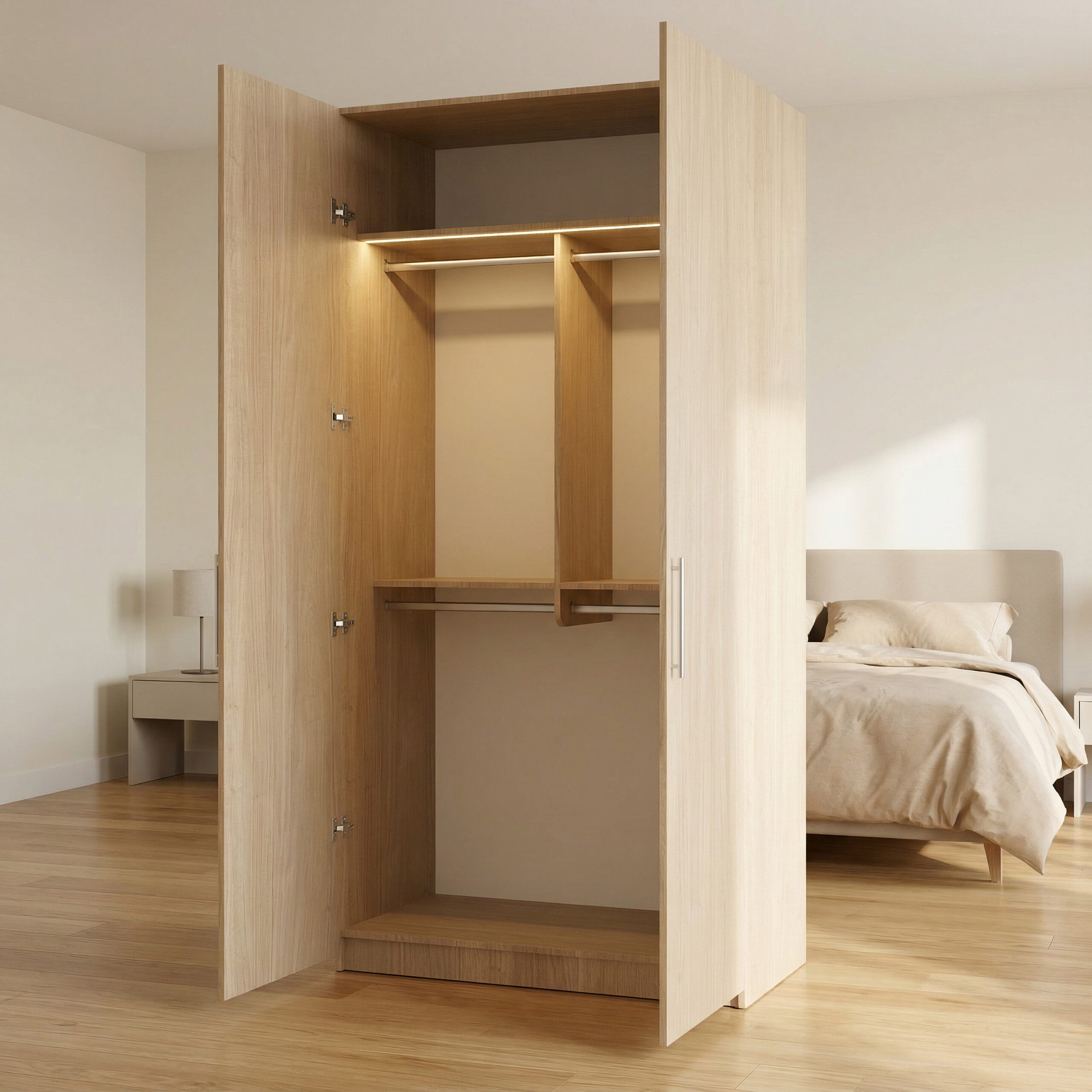 يجمع هذا التصميم من دواليب الخزائن الأمثل بين البساطة والعملية، ليكون مناسبًا لمن يبحث عن دولاب يوفر مساحة تعليق مريحة وتنظيمًا واضحًا للملابس مع إمكانية دمجه مع وحدات أخرى لتكوين خزانة ملابس متكاملة حسب المساحة والاحتياج.